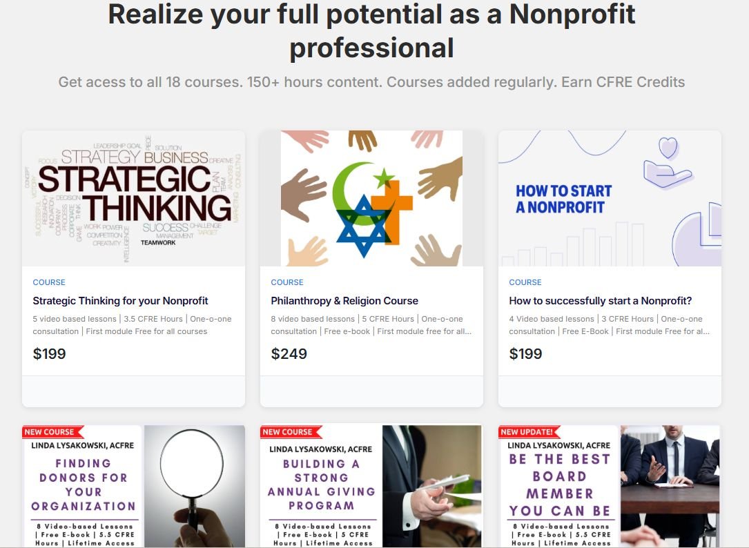 learnwithlinda.online is your one stop hub for learning. With over 100,000 professionals trained, Linda’s programs are grounded in real-world Nonprofit experience. All Courses are accredited. First module is always free.